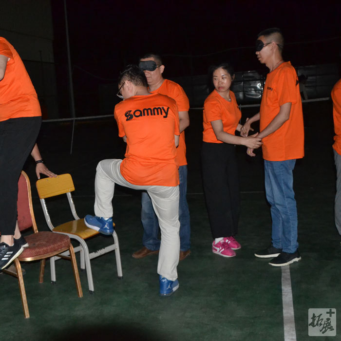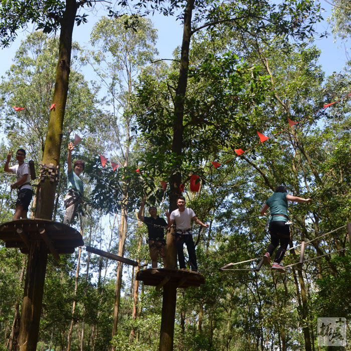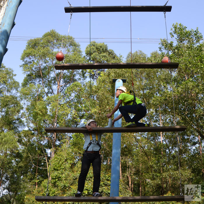 团队两两合作,在安全设施的保护下,爬到巨人梯的顶端,敲响顶端的钟,然后拥抱着下来。