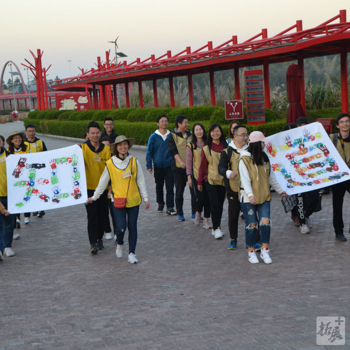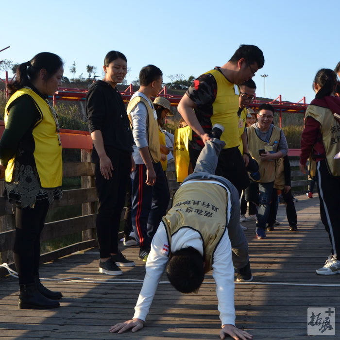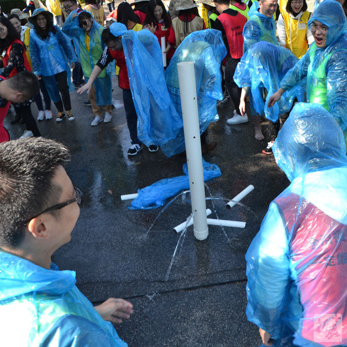 团队所有人参与灌水,将一条特别的水管(水管上有很多孔洞)灌满,让水管中的小球浮起来超过水管管壁的顶端。