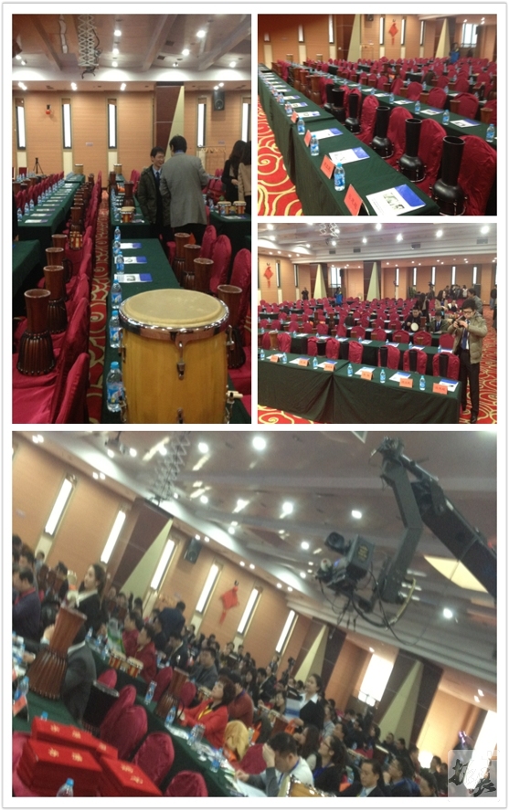 在影剧院或礼堂中,桌椅不可移动的会场,在会议开始前,将鼓及乐器布置在桌位上,在会议开始前或会议中,教练在舞台前带领团队鼓乐,并建立高、中、低声部的配合流程,让所有参加年会的人员体验团队、激情、快乐、震撼。并邀请领导登场指挥各个方阵合奏
